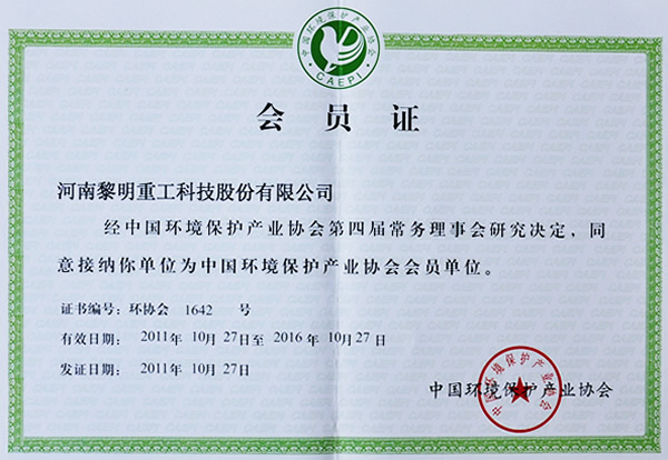 2011年10月27日,黎明重工正式加入中國環(huán)境保護(hù)協(xié)會(CEPA)。