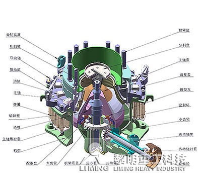 CS圓錐破碎機主要由機架、定錐總成、動錐總成、彈簧機構、碗型軸架部和傳動等部分組成;其輔助部分由電氣系統、稀油潤滑系統和液壓清腔系統組成。