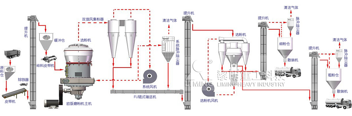 石灰石—石膏煙氣脫硫濕法工藝(FGD)及爐內噴鈣技術是目前世界上技術成熟、應用廣泛的控制SO2排放技術,不管是煙氣脫硫還是爐內噴鈣脫硫其脫硫介質均為石灰石粉,因此石灰石粉的制備則成為火電廠、鋼廠脫硫,提高脫硫效率的先決條件。黎明重工經過多年研究和使用,研發出一種新型的脫硫制粉設備和工藝,不僅能夠滿足煤粉爐石灰石—石膏煙氣脫硫濕法工藝(FGD),而且在循環流化床(CFB)脫硫領域獲得了廣泛應用。